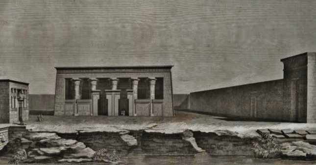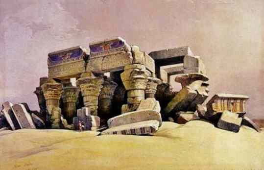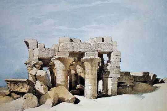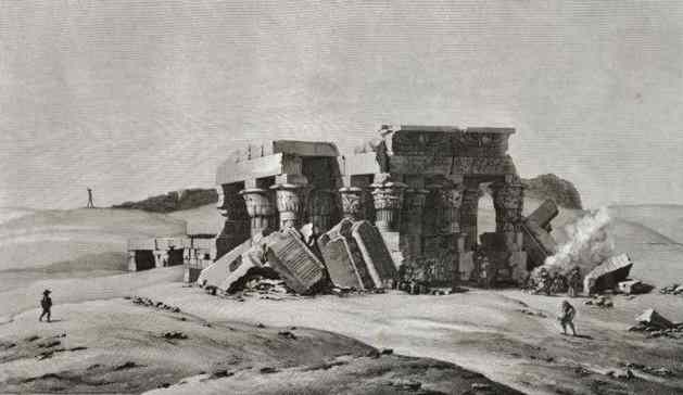 But before you enter this silence, between the amber and ruddy walls that will lead you on to Nubia, high up on a terrace, looking over a great bend of the river is Kom Ombo. And Kom Ombo is the temple of the crocodile god.