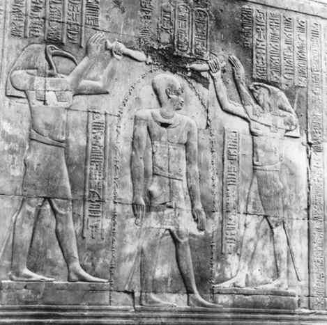 There are some fine reliefs scattered through these mighty ruins, showing Sobek with the head of a crocodile, Heru-ur with the head of a hawk so characteristic of Horus, and one strange animal which has no fewer than four heads, apparently meant for the heads of lions. One relief which I specially noticed for its life, its charming vivacity, and its almost amusing fidelity to details unchanged to-day, depicts a number of ducks in full flight near a mass of lotus-flowers.