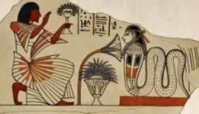 The cobra serpent was sacred from the earliest times to the present day. It was never identified with any of the great deities, but three goddesses appear in serpent form: Uazet, the Delta goddess of Buto; Mert-seger, "the lover of silence," the goddess of the Theban necropolis; and Rannut, the harvest goddess. The memory of great pythons of prehistoric days appears in the immense serpent Agap of the underworld in later mythology. The serpent has also been a popular object of worship apart from specific gods. We have already noted it on prehistoric amulets, and coiled round the hearths of the early dynasties. Serpents were mummified, and in the terra-cotta figures and jewelry of later times the serpent is very prominent. There were usually two represented together, one often with the head of Serapis, the other of Isis, so therefore male and female. Down to modern times a serpent is worshipped at Sheykh Heridy, and miraculous cures attributed to it.