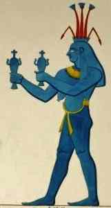 Hapi, the Nile, must also be placed with nature-gods. He is pictured as a man, or two men for the upper and lower Niles, holding a tray of produce of the land. He has large female breasts as the nourisher of the valley. A favorite group consists of the two Nile figures tying the plants of upper and lower Egypt around the emblem of union. He was worshipped at Nilopolis, and also at the shrines which marked the one hundred boating stages all along the river. Festivals were held at the rising of the Nile. Hymns in honor of the river attribute all prosperity and good to its benefits.